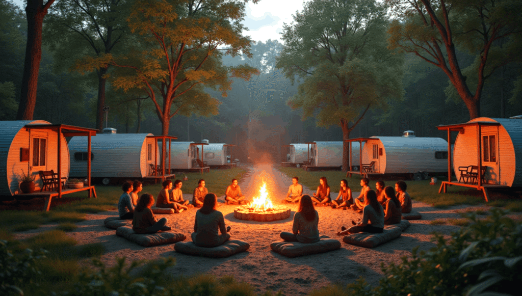 A mobile-first manufactured housing community platform that creates walkable neighborhoods designed specifically for single-car households. The concept clusters trailer homes within walking distance o